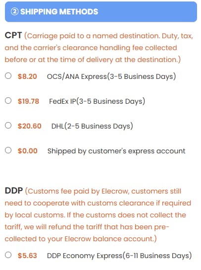 よくわからなかったので調べてみるとCPTの方がなんの略かいまいちはっきりしませんでしたが、DDPはDelivered Duty Paidの略でその名前の通り配送の間のすべて=つまり関税と送料のセットで払ってくれる仕組みのようです。上の画像の英語を訳してみると、配送先で関税処理が必要な場合はそちらでもやってもらうことがあるかもということ、もし関税がかからなかった場合はElecrowアカウントの残高にもらった分を返すとも書いてあります。